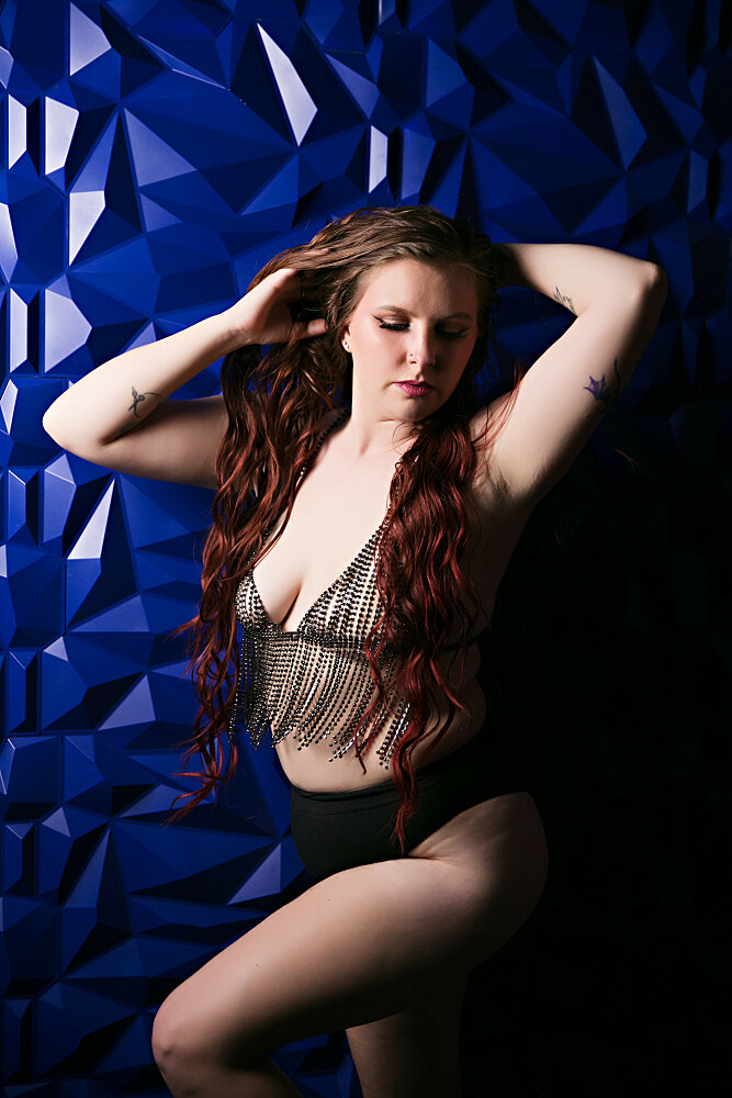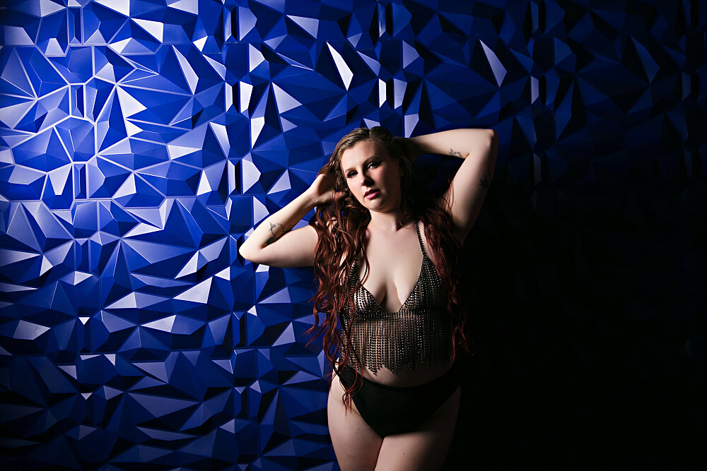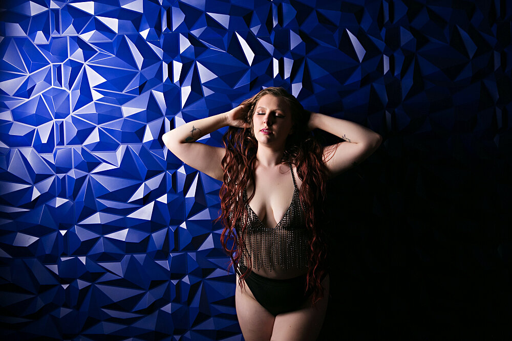 Woman posing in lingerie against a deep blue textured geometric backdrop in Salt Lake City.